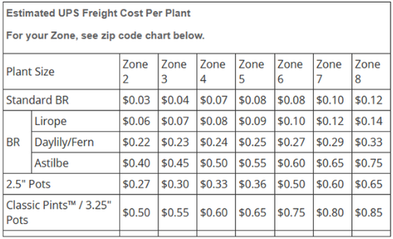Estimated UPS freight cost per plant (refer to zone chart below to determine your zone)